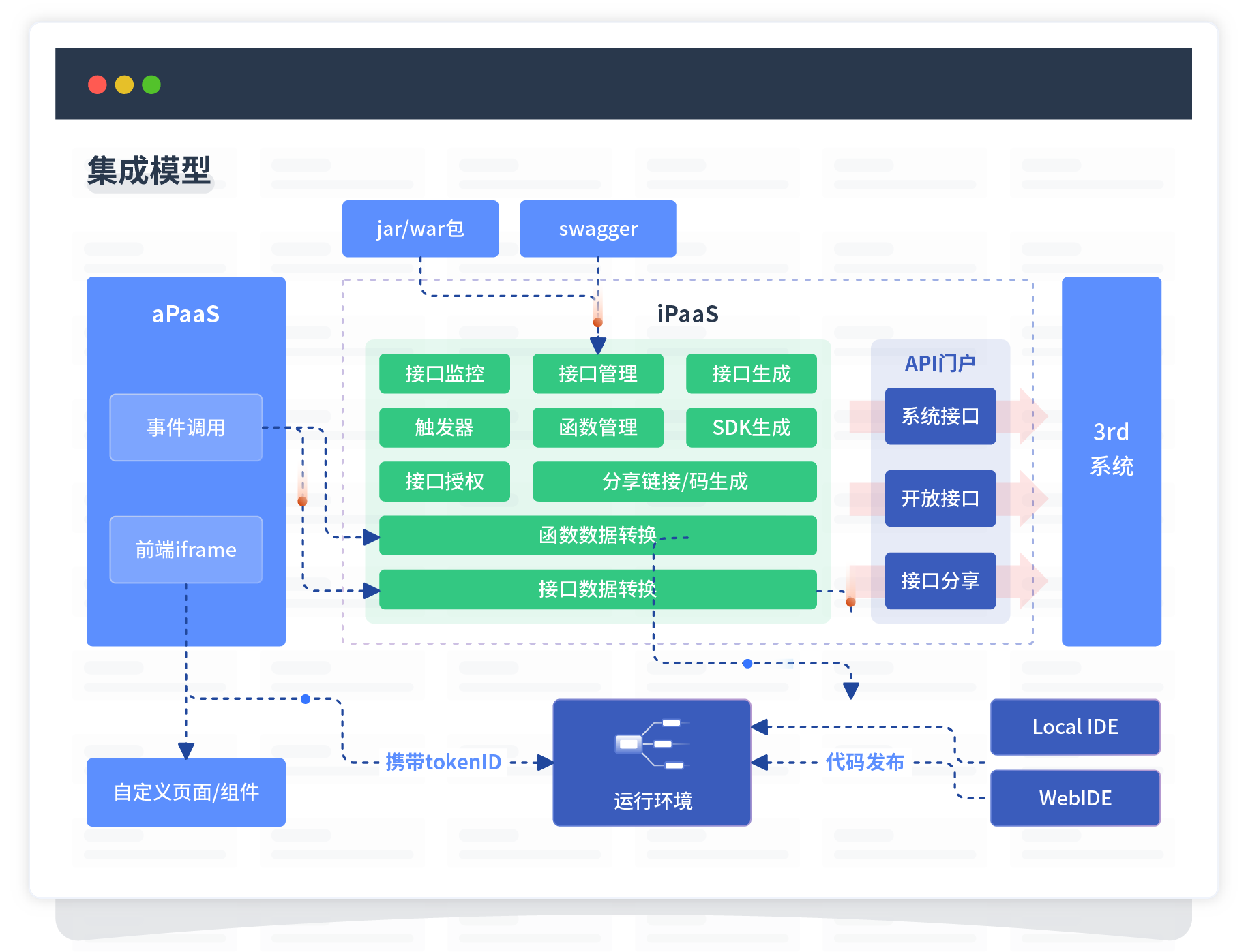 集成模型包括平台本身前、、、、、、、、、、后端能力的扩展,,,,,,,,,,,,,也支持通过API门户和第三方系统进行交互。。。。。。。。。。。