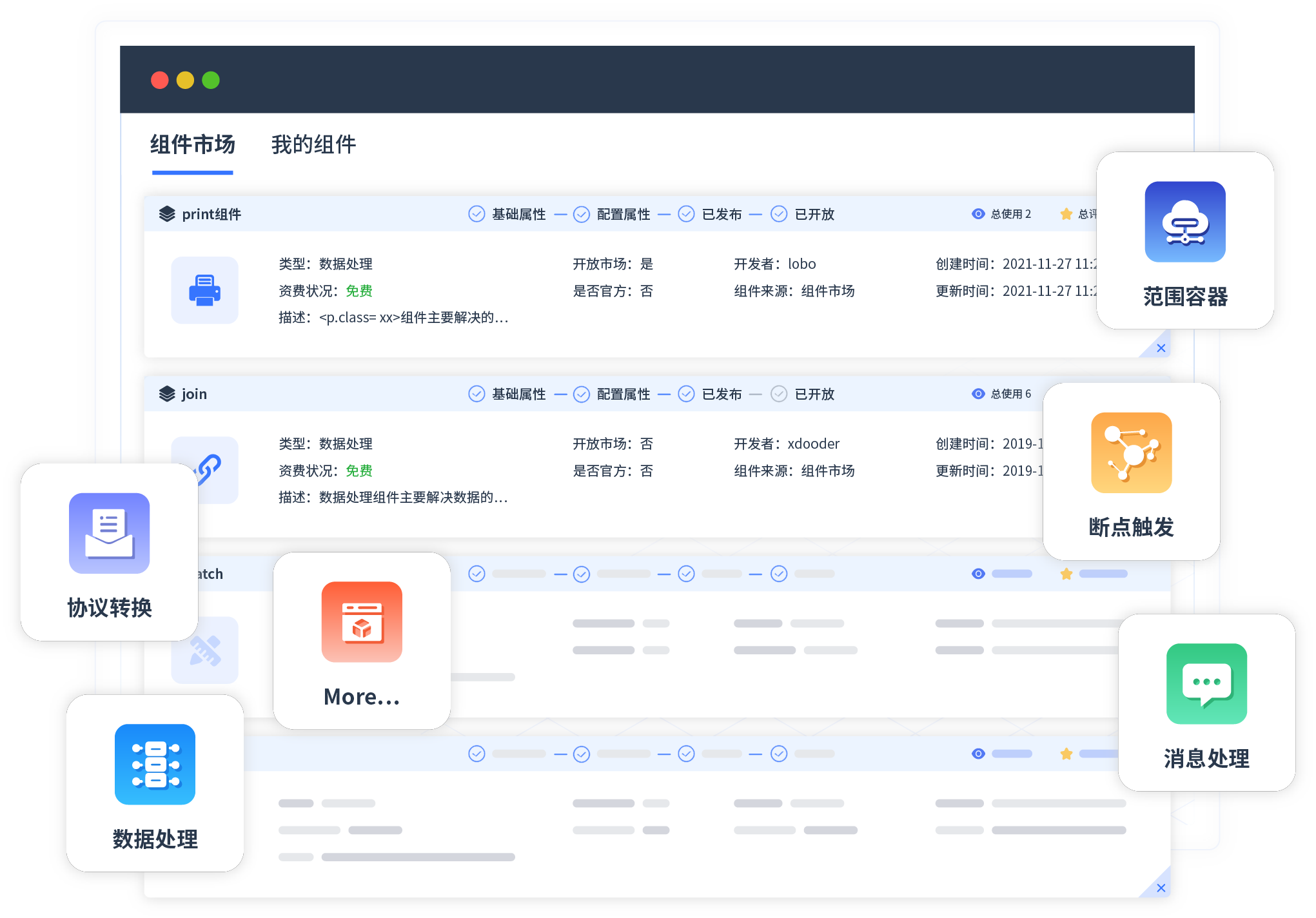 针对集成场景,,,,,,,,,,,,VIVO钱包提供组件市场,,,,,,,,,,,例如协议转换、、、、、、、、、消息处理、、、、、、文件操作等。。。。。除平台提供的组件外,,,,,,,,,,,,,客户可以自定义所需组件。。。。。。