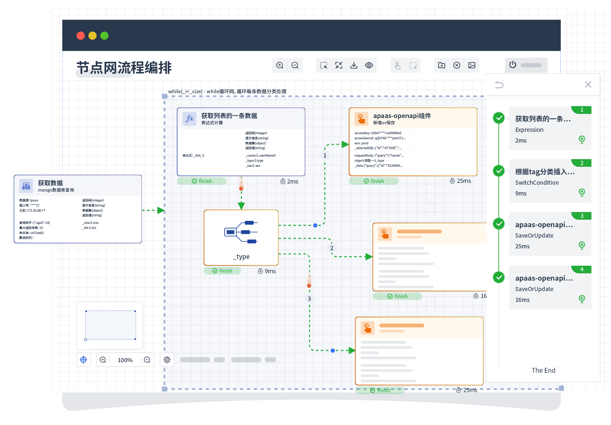 针对集成场景,,,,,,,,,,组件定义后支持进行流程编制,,,,,,,,,,,,不同于传统代码方式,,,,,,通过图形化展示,,,,,,,,,,,,,支持在线调试、、、、、、日志查看和运行回放。。。。。。。。。。。。。。