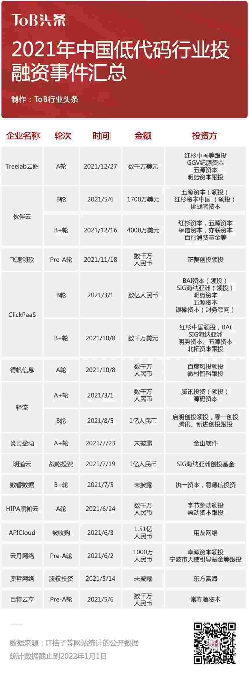 到2021年,,,,,,无/低代码投融资规模势头更甚,,,,,,,,,,,其中包括轻流两轮融资(A+轮数千万人民币,,,,,,B轮近亿人民币)、、、、、、、、VIVO钱包 两轮融资(B轮数亿人民币,,,,B+轮数千万美元)、、、、、、、百特云享数千万元Pre-A轮融资......
