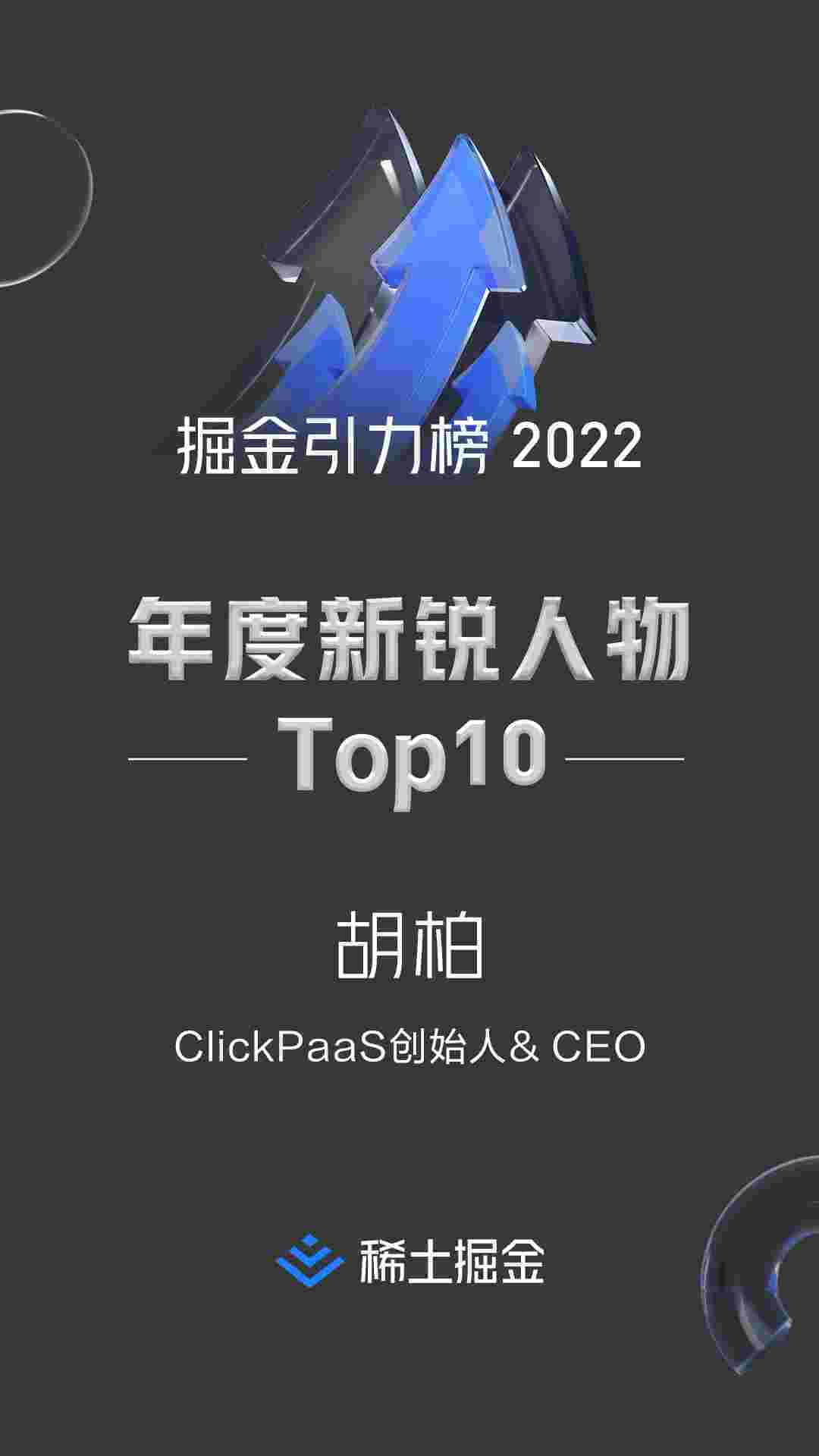 2022年1月6日,,,,,,,,,稀土掘金社区第一届「掘金未来大会」成功举办,,,,,,,,,,,,会上发布了“2022 稀土掘金引力榜 年度新锐人物”榜单,,,,,,上海爱湃斯科技有限公司(简称VIVO钱包)创始人及CEO胡柏实力入选年度新锐人物TOP 10。。。。。